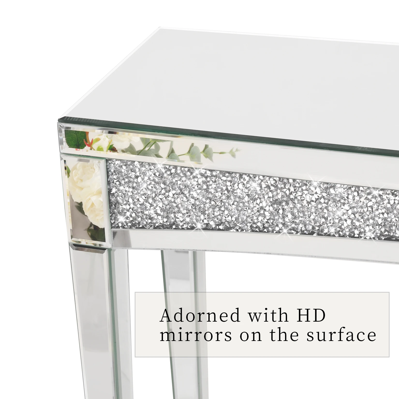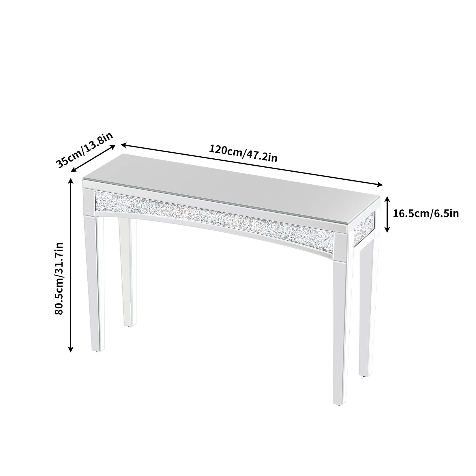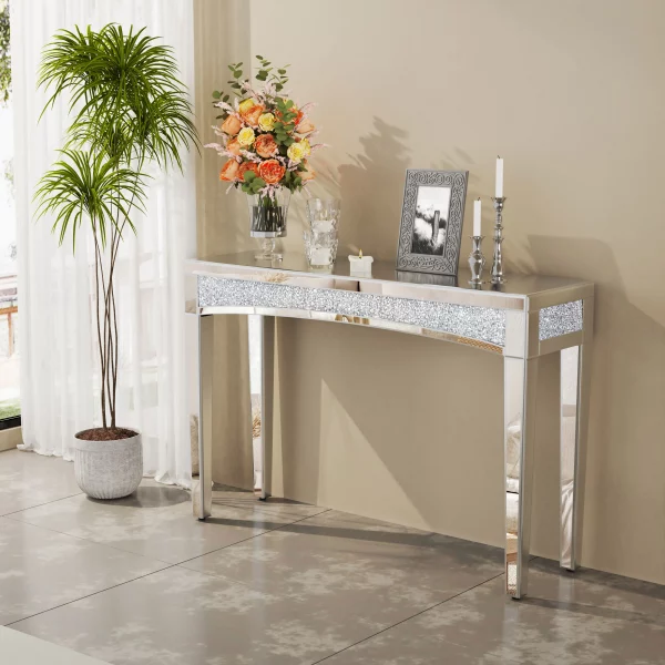 Transform your space with this exquisite mirrored console table, designed to bring modern sophistication and radiant glamour to your home. With a dazzling crushed diamond inlay and a sleek glass finish, this table is the perfect blend of functionality and luxury.